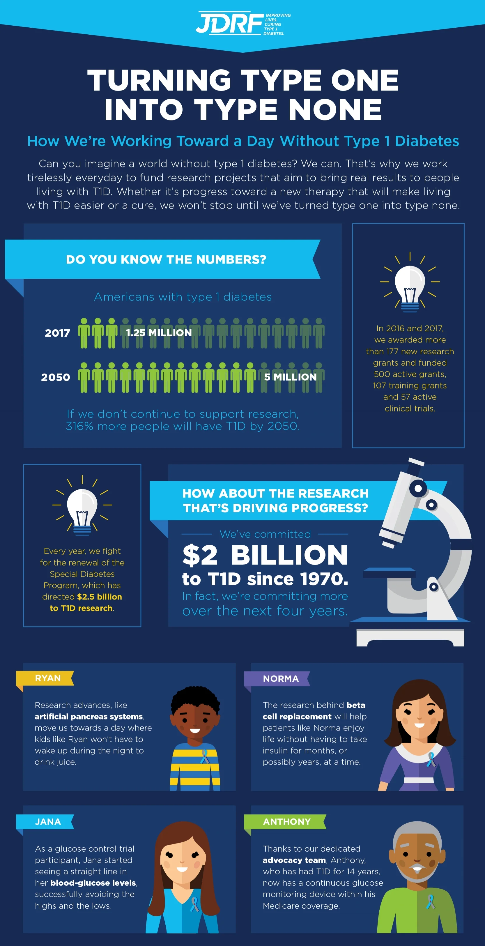 Infographic for JDRF illustrations the struggles of living with T1D and JDRF’s work into helping and finding a cure.